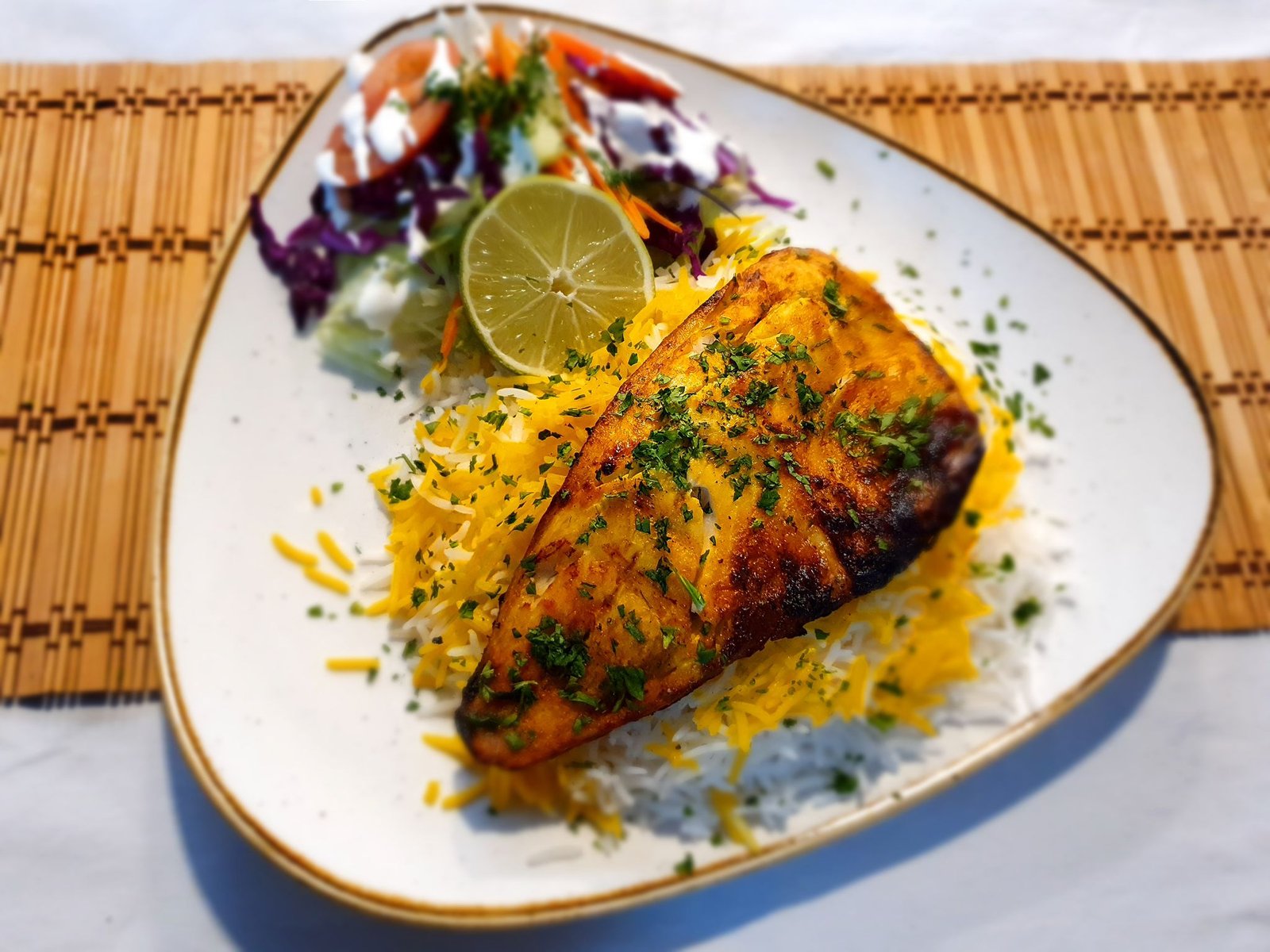 Tender diced lamb cooked with grilled aubergine, tomato and saffron sauce.